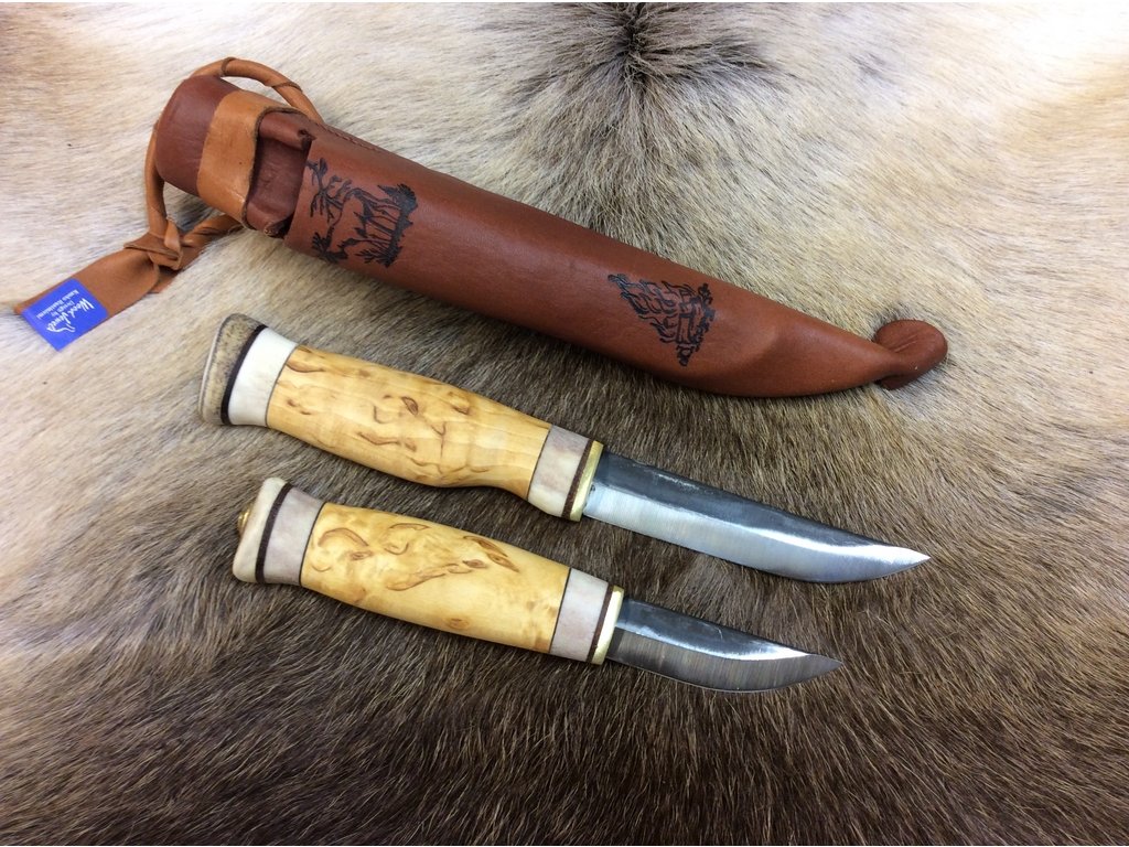 Sada dvoch fínskych nožov v jednom puzdre. Skladá sa z dvoch tradičných škandinávskych nožov puukko s dĺžkou čepele 10,5 cm a 6,0 cm. Jedná sa o univerzálne nože na bežné použitie v prírode a prácu s drevom. Čepele sú vyrobené z uhlíkovej ocele 80CrV2, ktorá vyniká vysokou húževnatosťou. Rukoväte z kučeravej brezy a sobieho parohu sú ergonomicky tvarované a príjemne padnú do ruky. Tieto nože sú dodávané v koženom puzdre, ktoré ponúka priestor pre oba nože.