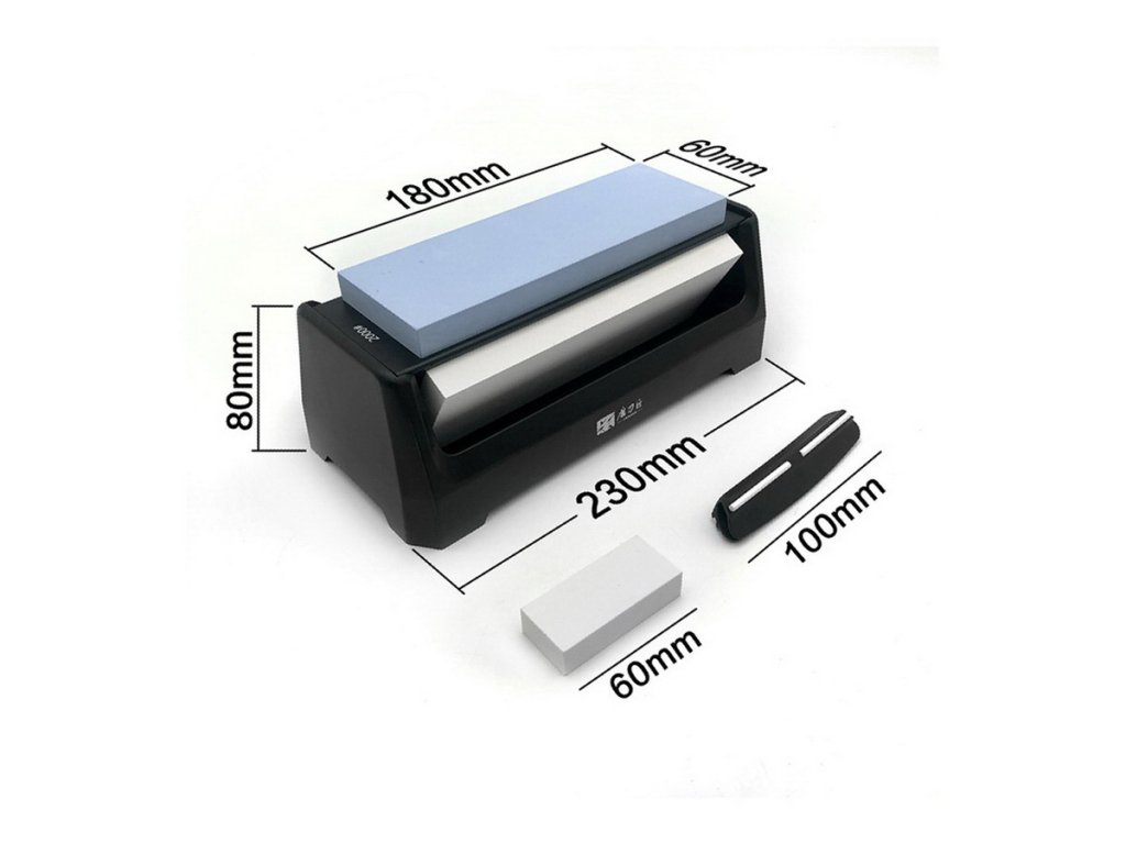 Balenie obsahuje plastový protišmykový stojan na kameň, vodítko na brúsenie noža, a malý vyrovnávací (korekčný kameň).
