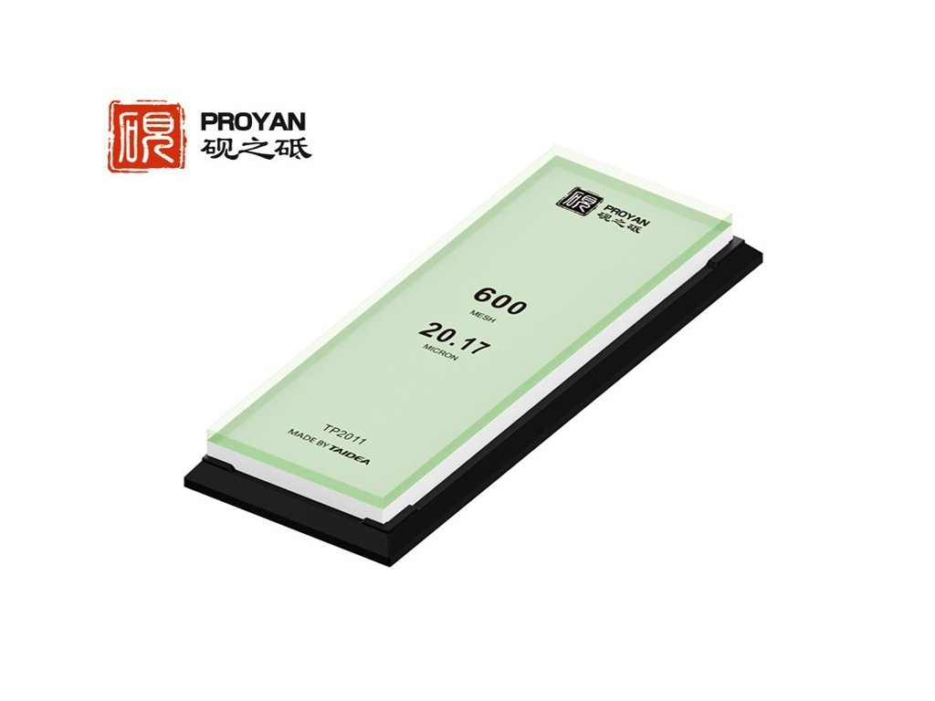Vodný brúsny kameň, zrnitosti 600. Kameň má na spodnej časti základňu z tvrdeného skla. Vďaka tomu je kameň bez deformácií a nehrozí jeho ohnutie. Bežné brúsne kamene sa môžu mikroskopicky deformovať absorbovaním vody, ale kamene Taidea Glass Stone riešia tento problém svojou extrémne plochou základňou z tvrdeného skla. Ďalšou výhodou sklenenej základne je, že zrnitosť na spodnej strane je vždy viditeľná aj po dlhom používaní. Rozmer brúsnej plochy je 20 x 7 cm, vďaka čomu na kameni pohodlne nabrúsite aj väčšie nože. Kameň je uložený v plastovom podstavci. Protišmykové nožičky na podstavci zaisťujú bezpečné a stabilné brúsenie. Tento brúsny kameň nabrúsi vreckové aj pevné nože všetkých druhov a je možné ho použiť aj na kuchynské nože.