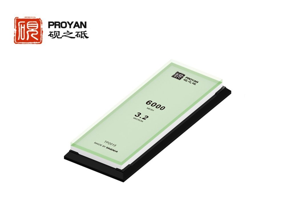 Vodný brúsny kameň, zrnitosti 6000. Kameň má na spodnej časti základňu z tvrdeného skla. Vďaka tomu je kameň bez deformácií a nehrozí jeho ohnutie. Bežné brúsne kamene sa môžu mikroskopicky deformovať absorbovaním vody, ale kamene Taidea Glass Stone riešia tento problém svojou extrémne plochou základňou z tvrdeného skla. Ďalšou výhodou sklenenej základne je, že zrnitosť na spodnej strane je vždy viditeľná aj po dlhom používaní. Rozmer brúsnej plochy je 20 x 7 cm, vďaka čomu na kameni pohodlne nabrúsite aj väčšie nože. Kameň je uložený v plastovom podstavci. Protišmykové nožičky na podstavci zaisťujú bezpečné a stabilné brúsenie. Tento brúsny kameň nabrúsi vreckové aj pevné nože všetkých druhov a je možné ho použiť aj na kuchynské nože.