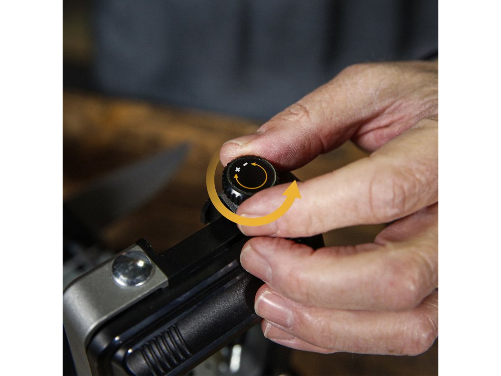 Pri práci s dlhšími nožmi, napríklad s kuchynskými nožmi sa môže stať, že vám budú nože pri otáčaní narážať do stola – v takom prípade stačí potiahnuť poistku na chrbte konštrukcie a konštrukciu nahnúť dozadu, do polohy označenej číslom 2. Týmto vznikne pod nožom dostatok miesta na otočenie bez toho aby ste ho museli zo svorky vybrať.