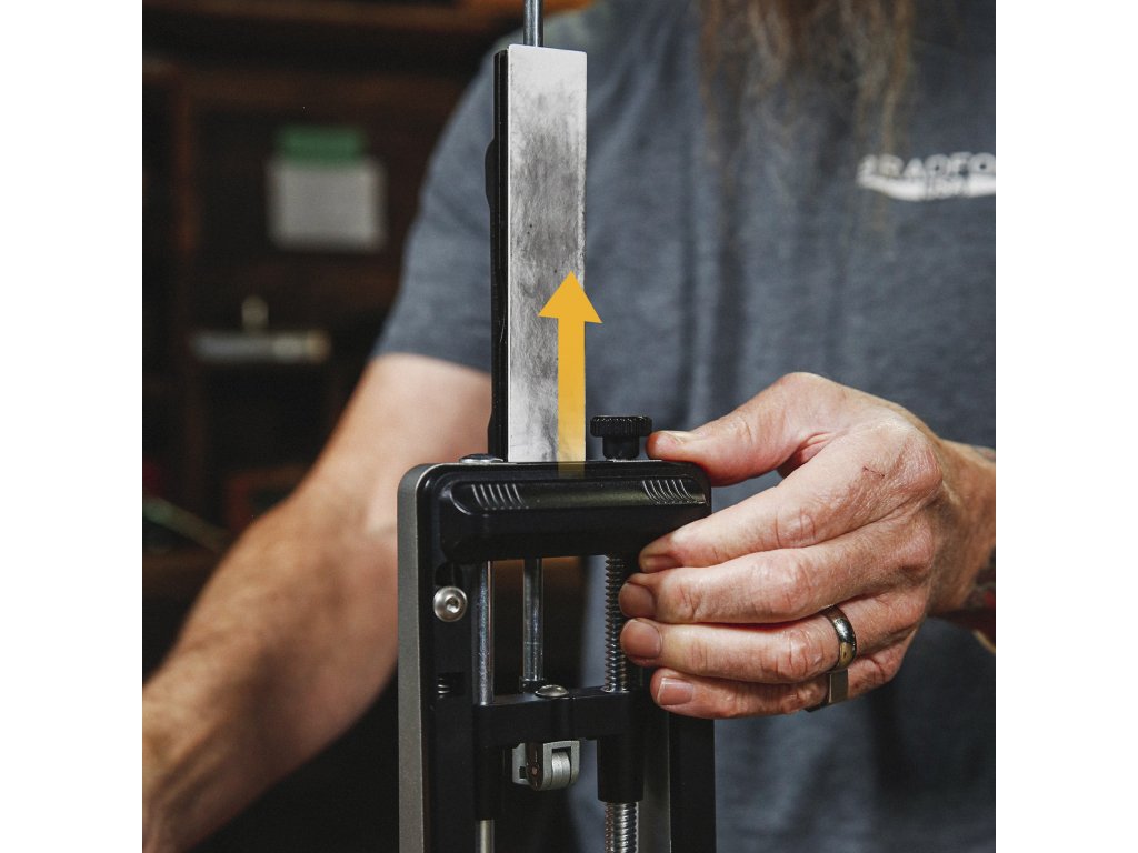 Ako používať brúsny stôl si môžete pozrieť na tomto linku. Ostrie noža má byť položené na žltej čiare, od začiatku čepele až po špičku. Chrbát čepele má byť proti posuvnej časti systému. Pomocou otočných gombíkov nastavíte požadované umiestnenie ostria.