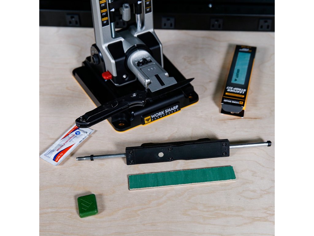 Náhradný kožený brúsny pás do brúsnej sady Work Sharp Professional Precision Adjust. Koža na oceľovej podložke je pokrytá veľmi jemnou zelenou brúsnou pastou, je určená pre záverečné leštenie noža po brúsení.