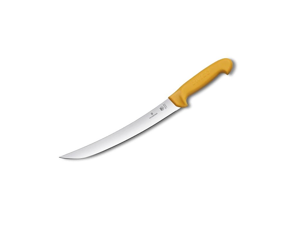 Nôž Victorinox 5.8435.26 Swibo s čepeľou dĺžky 26 cm z nerezovej ocele slúži na otvorenie tepny zvieraťa pri domácej porážke (zabíjačke) a následné vykrvavenie. Séria Swibo je ideálna aj do profesionálneho prostredia, kde je dôležitá ostrosť a vysoká odolnosť. Rukoväť nápadnej žltej farby je z polyamidu, ktorý je mimoriadne pevný, odolný voči nárazom a vysoko hygienický. Pre väčšiu bezpečnosť je rukoväť predĺžená smerom k čepeli, vďaka čomu je práca s nožom presnejšia a pod väčšou kontrolou.