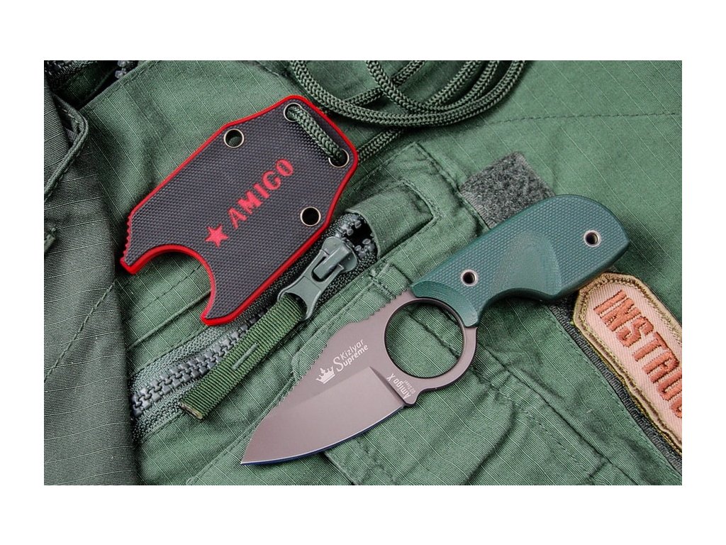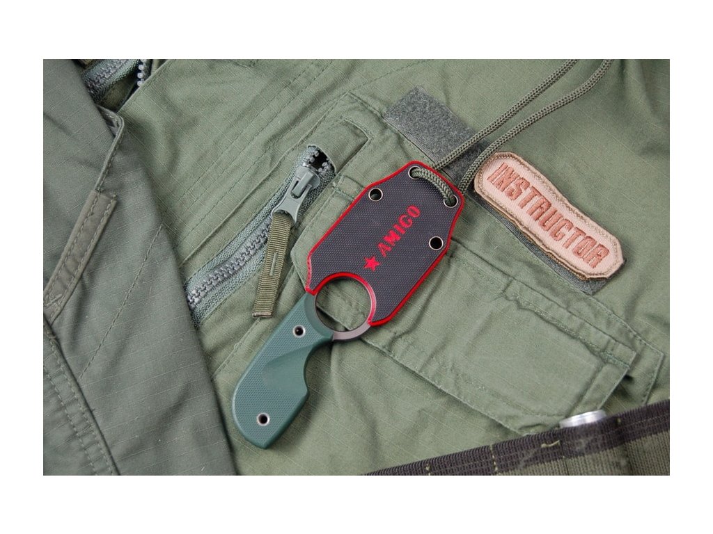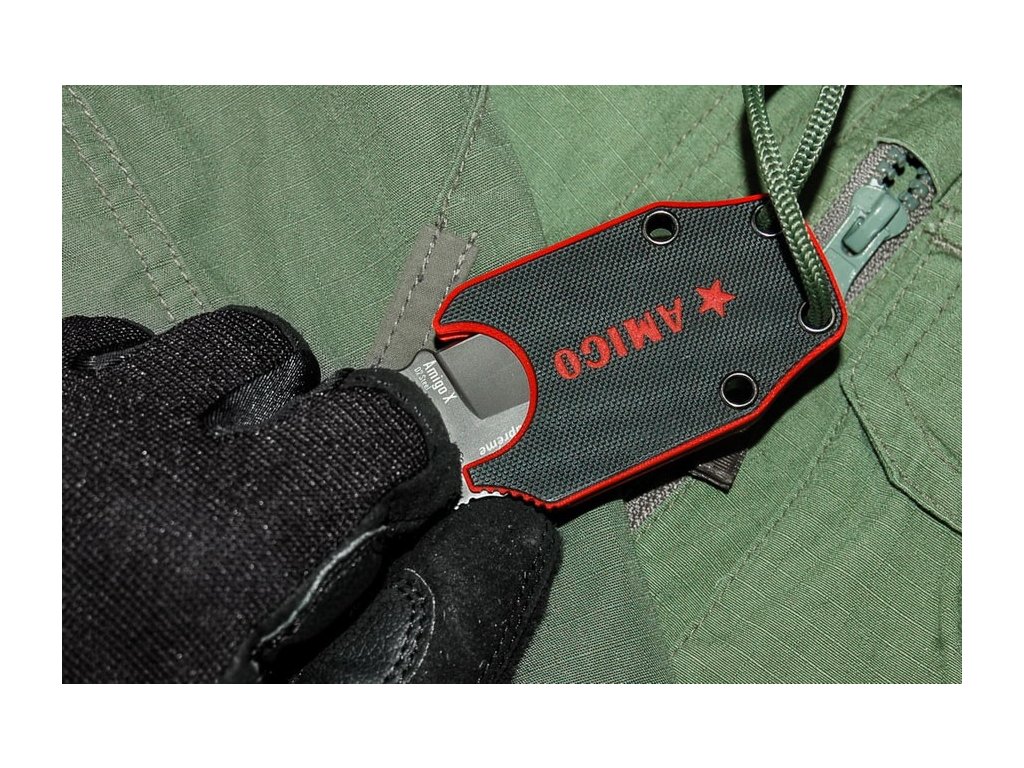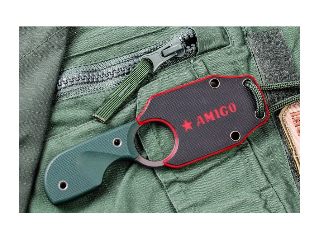 Amigo je nôž s pevnou čepeľou určený predovšetkým pre nosenie na krku. Čepeľ dlhá 6,9 cm, z nástrojovej "polonerezovej" ocele D2 s dutým výbrusom a povrchovou úpravou gray titanium. Rukoväť zo zelenej G10, kydexové puzdro.