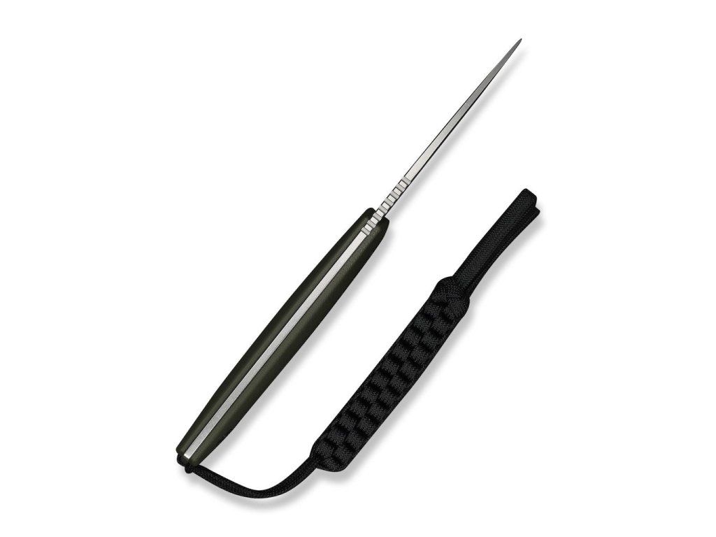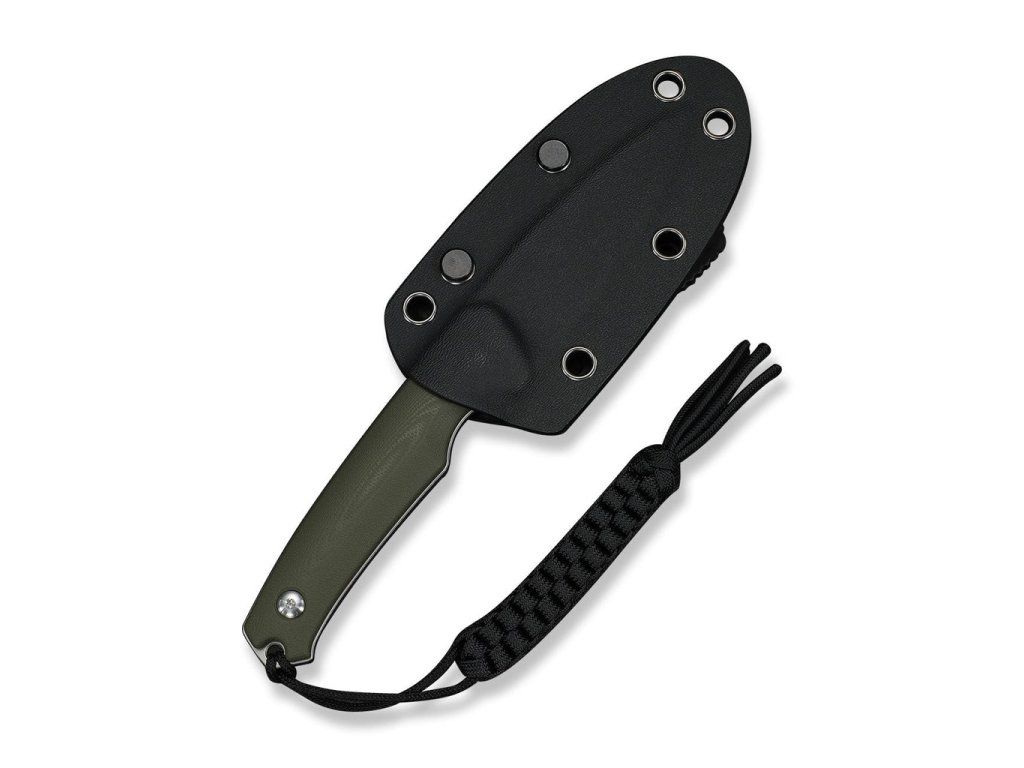 Ergonomická rukoväť zo zelenej G10. Na konci rukoväte je zapletený paracord čiernej farby.