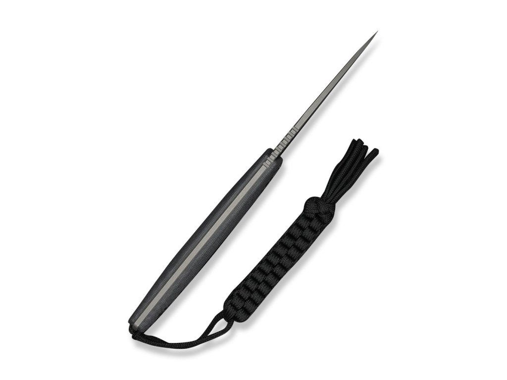 Ergonomická rukoväť z čiernej a sivej vzorovanej G10. Na konci rukoväte je zapletený paracord čiernej farby.