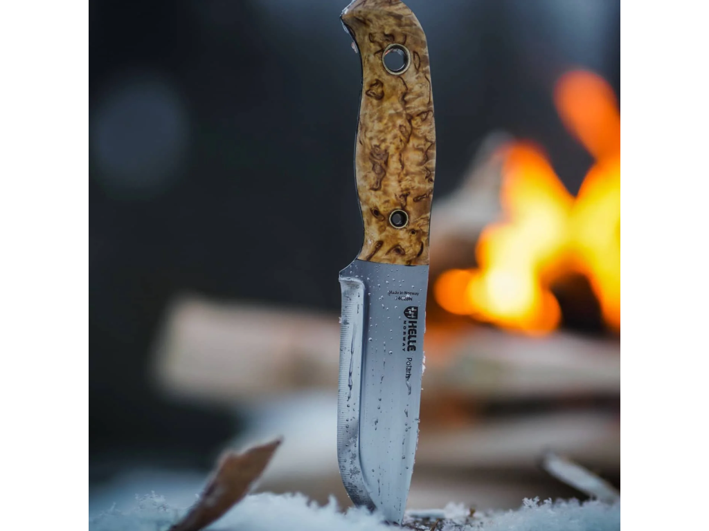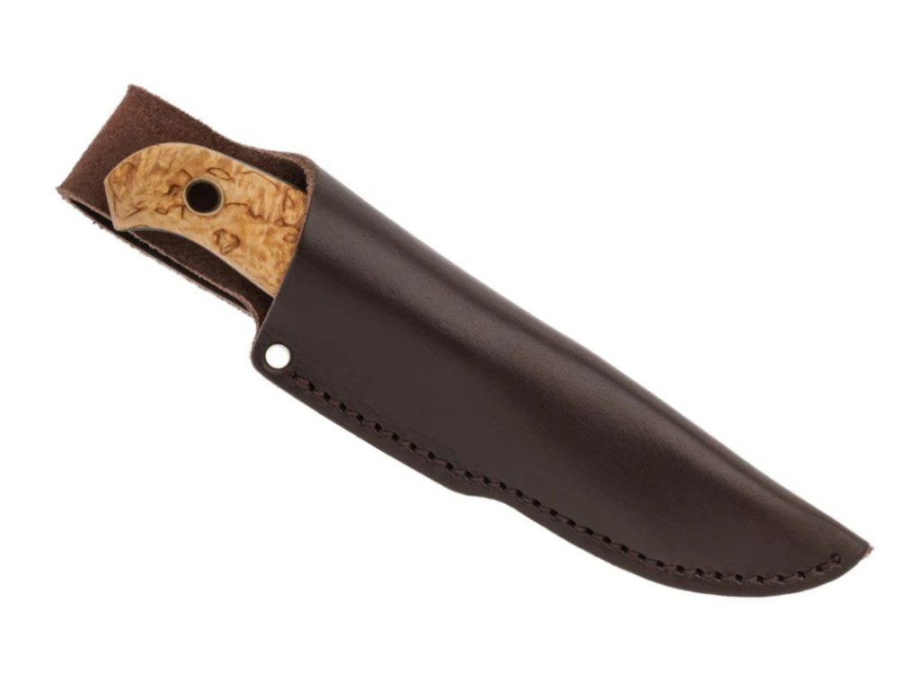 Čepeľ dĺžky 8 cm z nerezovej ocele Sandvik 14C28N má škandinávsky výbrus. Ergonomicky tvarovaná rukoväť z dreva kučeravej brezy pre pohodlný úchop.