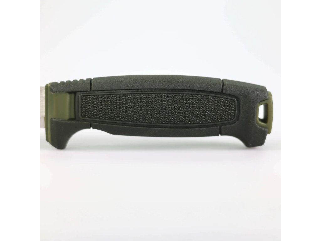 Inovatívnym prvkom je rukoväť, ktorá je plochejšia oproti klasickým outdoorovým nožom Mora. Trojzložková konštrukcia kombinuje pevné jadro z polypropylénu s vonkajšou vrstvou z TPE (pevný termoplast). Na rukoväti sa nachádza plocha s protišmykovou úpravou, na konci je otvor na paracord (lanyard hole). Deep Forests je tmavozelená farba s až takmer čiernym odtieňom.