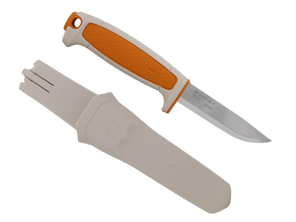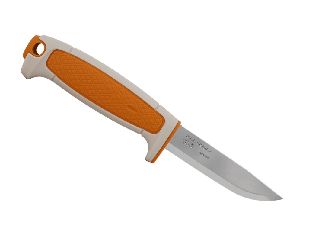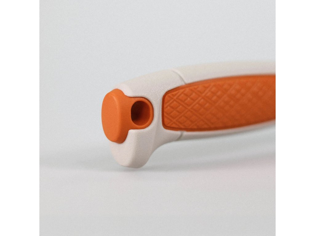 Valcovitá ergonomická rukoväť z odolného polypropylénu v béžovo-oranžovej farebnej kombinácii je inšpirovaná klasickými remeselníckymi nožmi Morakniv. Na rukoväti sa nachádza plocha s protišmykovou úpravou, na konci je otvor na paracord (lanyard hole).