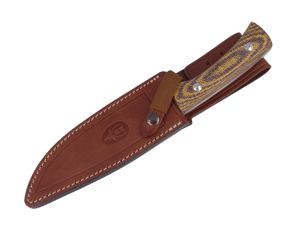 Lovecký nôž Jabali-17G od španielskej firmy Muela Manufacturas je robustný a odolný nôž s full-tang konštrukciou vhodný pre poľovníkov, na táborenie a do prírody. Čepeľ tvaru bowie dĺžky 17 cm je vďaka hrúbke 4,5 mm pomerne masívna. Čepeľ z nerezovej ocele X50CrMoV15 má povrchovú úpravu satin a dutý výbrus. Rukoväť z micarty hnedej farby so vzorom. Súčasťou balenie je kvalitné kožené puzdro s možnosťou zavesenia na opasok.