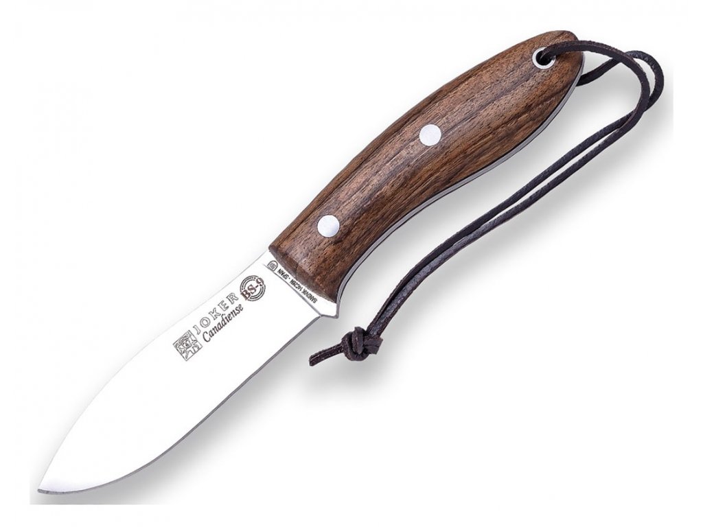 Joker Canadiense je tvarom veľmi zaujímavý nôž typu nessmuk. Canadiense je stredne veľký nôž do prírody full tang konštrukcie (vyrobený z jedného kusu ocele). Je to univerzálny nôž do lesa, ktorý zvládne všetky potrebné činnosti. Full tang konštrukcia zaisťuje jeho pevnosť a spoľahlivosť. Čepeľ z nerezovej ocele Sandvik 14C28N, s matnou povrchovou úpravou má dĺžku 10,5 cm a plochý výbrus. Rukoväť z orechového dreva je skutočnou ozdobou tohto noža.