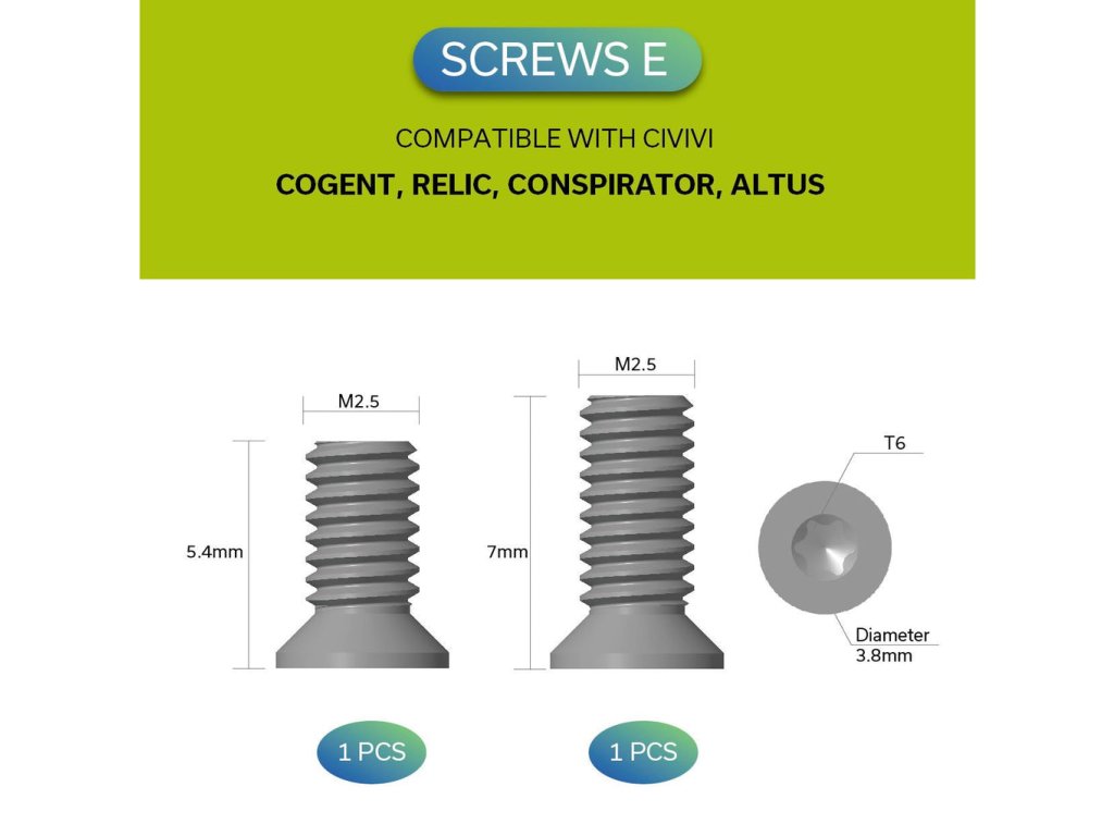 Skrutky E sú určené pre série Civivi: Cogent, Relic, Conspirator, Altus, Sachse a Crowley.