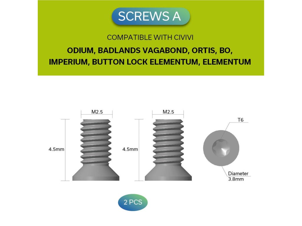 Skrutky A sú určené pre série Civivi: Odium, Badlands Vagabond, Ortis, Bo, Imperium, Button Lock Elementum a Elememtum.