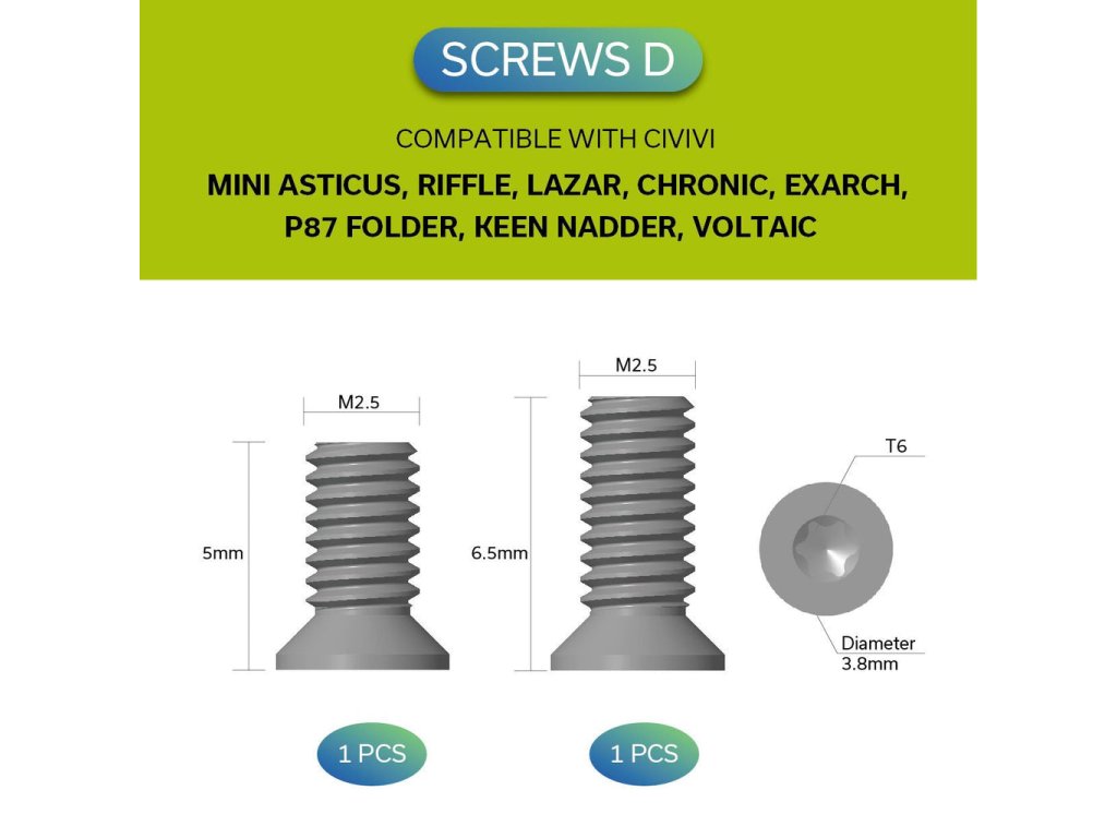 Skrutky D sú určené pre série Civivi: Mini Asticus, Riffle, Lazar, Chronic, Exarch, P87 Folder, Keen Nadder, Voltaic a Brazoria.