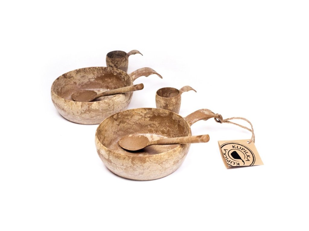 Táto darčeková sada pre dvoch obsahuje misku Kupilka 55, malý pohárik Kupilka 5 a lyžicu. Vyrobený je z materiálu Kareline®. Tento materiál je unikátny spojením vlákien z borovicového dreva a termoplastu v pomere 50:50. Spája výhody dreva a plastu. Je nerozbitný, znáša teploty od -30°C až do +110°C, je pevný a ľahký. Takisto neabsorbuje pachy z potravín, jednoducho sa čistí a nie je citlivé voči vlhkosti ako klasický drevený riad.