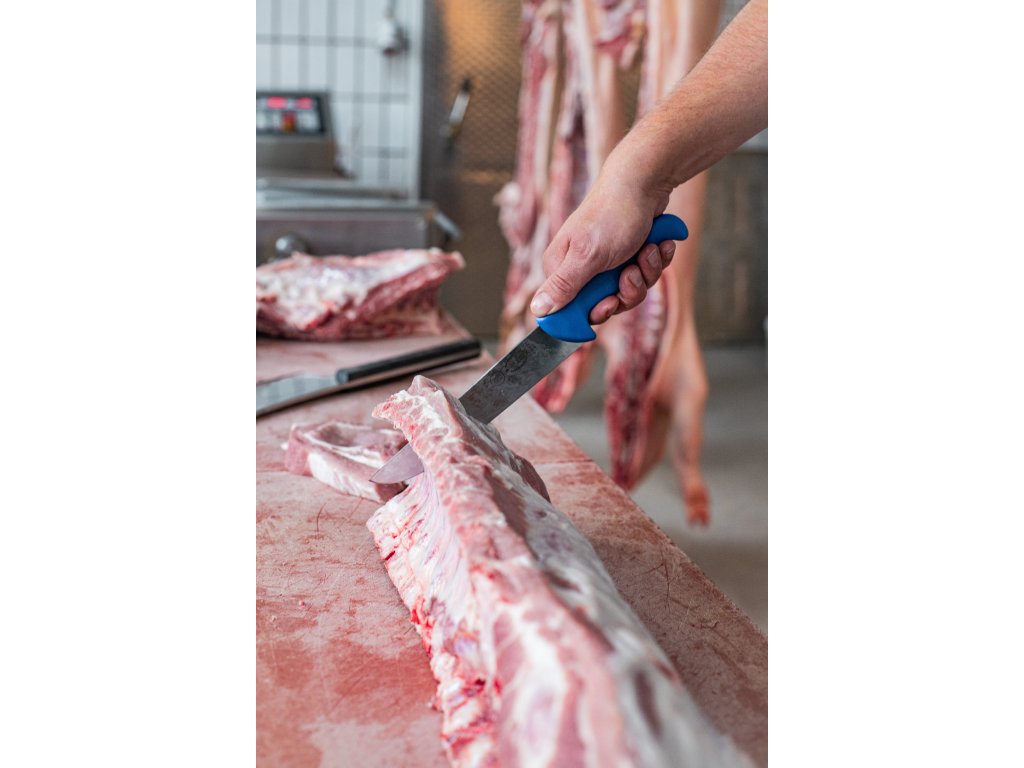 Profesionálny mäsiarsky nôž F. Dick ErgoGrip 8234821 má širokú a stabilnú čepeľ dĺžky 21 cm z nerezovej ocele X55CrMo14 s tvrdosťou 56 HRC. Vyznačuje sa ergonomickou rukoväťou z modrého plastu pre pohodlný a bezpečný úchop aj v mokrom prostredí. Medzi čepeľou a rukoväťou sa nenachádzajú žiadne špáry, v ktorých by sa mohli zachytiť tekutiny. Rukoväť neabsorbuje mastnotu ani nečistoty.