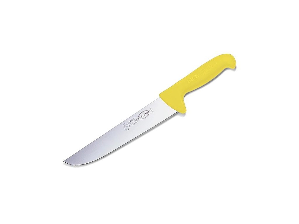 Profesionálny mäsiarsky nôž F. Dick ErgoGrip 8234826-02 má širokú a stabilnú čepeľ dĺžky 26 cm z nerezovej ocele X55CrMo14 s tvrdosťou 56 HRC. Vyznačuje sa ergonomickou rukoväťou zo žltého plastu pre pohodlný a bezpečný úchop aj v mokrom prostredí. Medzi čepeľou a rukoväťou sa nenachádzajú žiadne špáry, v ktorých by sa mohli zachytiť tekutiny. Rukoväť neabsorbuje mastnotu ani nečistoty.