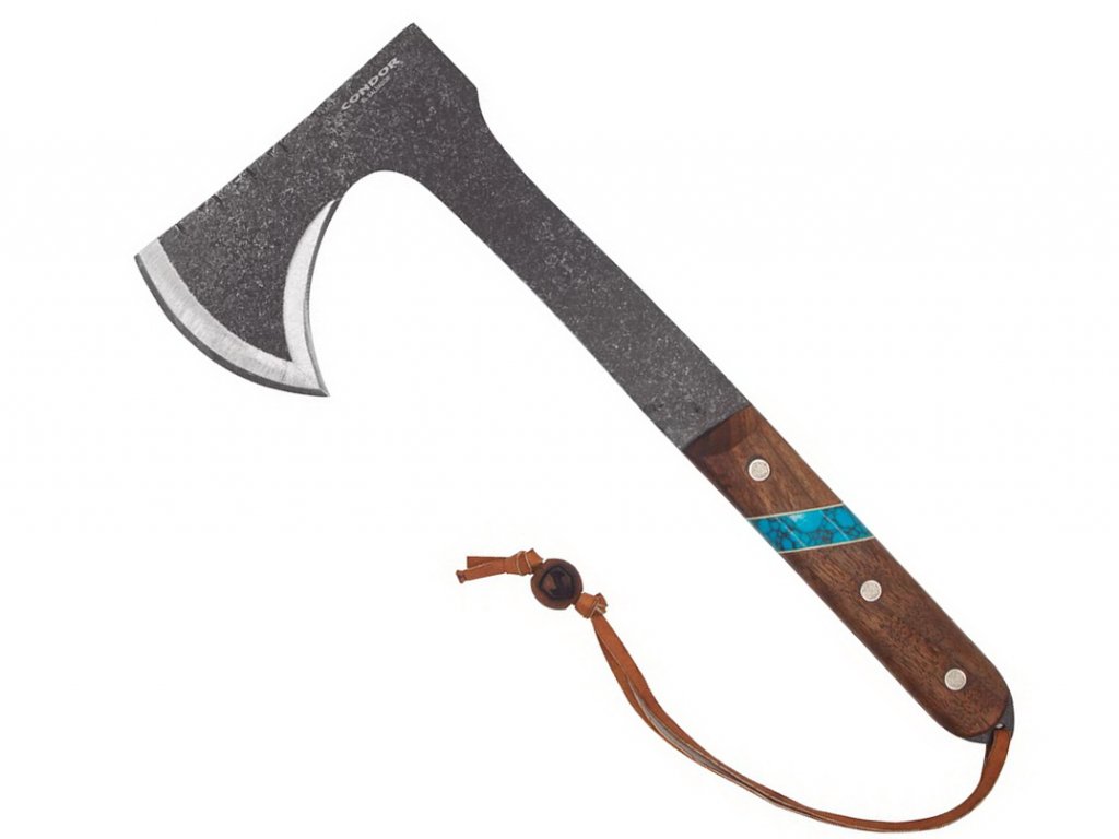 Sekera tvaru tomahawk od Condor TK váži iba 578g, vďaka čomu je ľahko použiteľná aj jednou rukou a to v lese či záhrade. Sekera je vyrobená z vysoko uhlíkovej ocele 1075 s vyššou húževnatosťou, využiteľnou na sekanie a ťažšiu prácu. Nástroj má klasickú Condor povrchovú úpravu. Sekera ma konvexný výbrus, typický pre kvalitnejšie nástroje na sekanie a rúbanie. Cieľom výbrusu je zachovať čo najviac materiálu za ostrím, čo prinesie lepšiu životnosť a váhu čepele, ktorá zvyšuje silu seknutia. Rukoväť je vyrobená z orechového dreva a tyrkysového kameňa, na ktorej konci sa nachádza lanyard hole, diera na prevlečenie šnúrky. Sekera sa dodáva s hnedým koženým púzdrom – chráničom čepele.