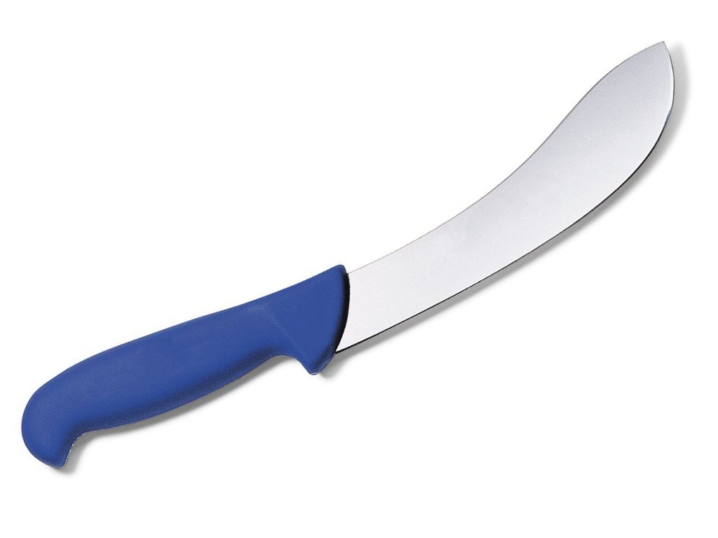 Profesionálny mäsiarsky nôž F. Dick ErgoGrip 8226418 so širokou zahnutou čepeľou dĺžky 18 cm z nerezovej ocele X55CrMo14 s tvrdosťou 56 HRC slúži na sťahovanie kože a spracovanie mäsa. Vyznačuje sa ergonomickou rukoväťou z modrého plastu pre pohodlný a bezpečný úchop aj v mokrom prostredí. Medzi čepeľou a rukoväťou sa nenachádzajú žiadne špáry, v ktorých by sa mohli zachytiť tekutiny. Rukoväť neabsorbuje mastnotu ani nečistoty.