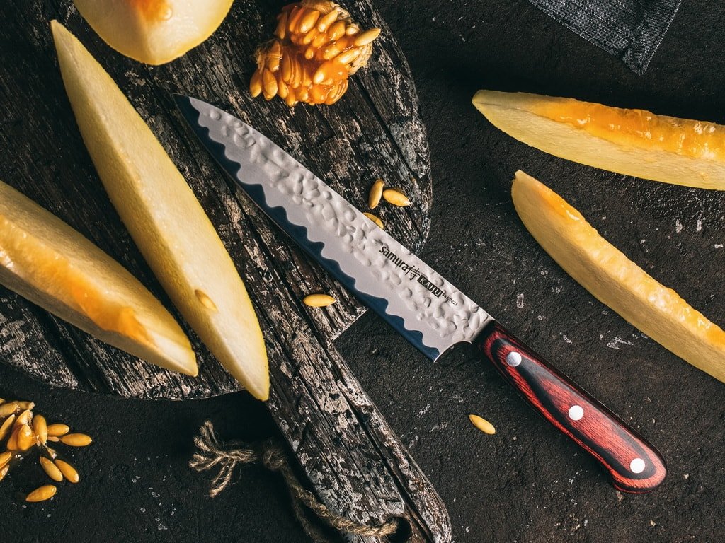 Nože Samura Kaiju sú kvalitné kuchynské nože, ktoré ponúkajú klasické tvary, rukoväť z odolného kompozitného materiálu pakkawood (spojenie dreva a epoxidových živíc) a čepele z japonskej nerezovej ocele AUS-8. Povrchová úprava čepele hammered steel pôsobí veľmi pútavo a zabezpečuje plynulé krájanie, bez toho aby sa krájané jedlo lepilo na nôž.
