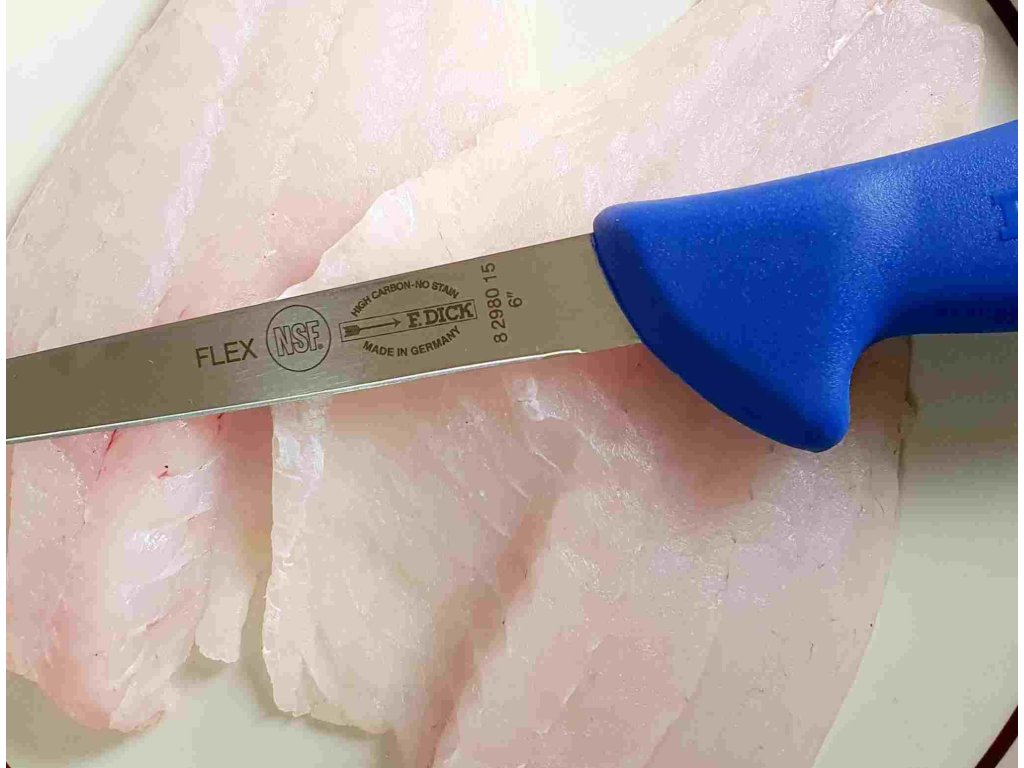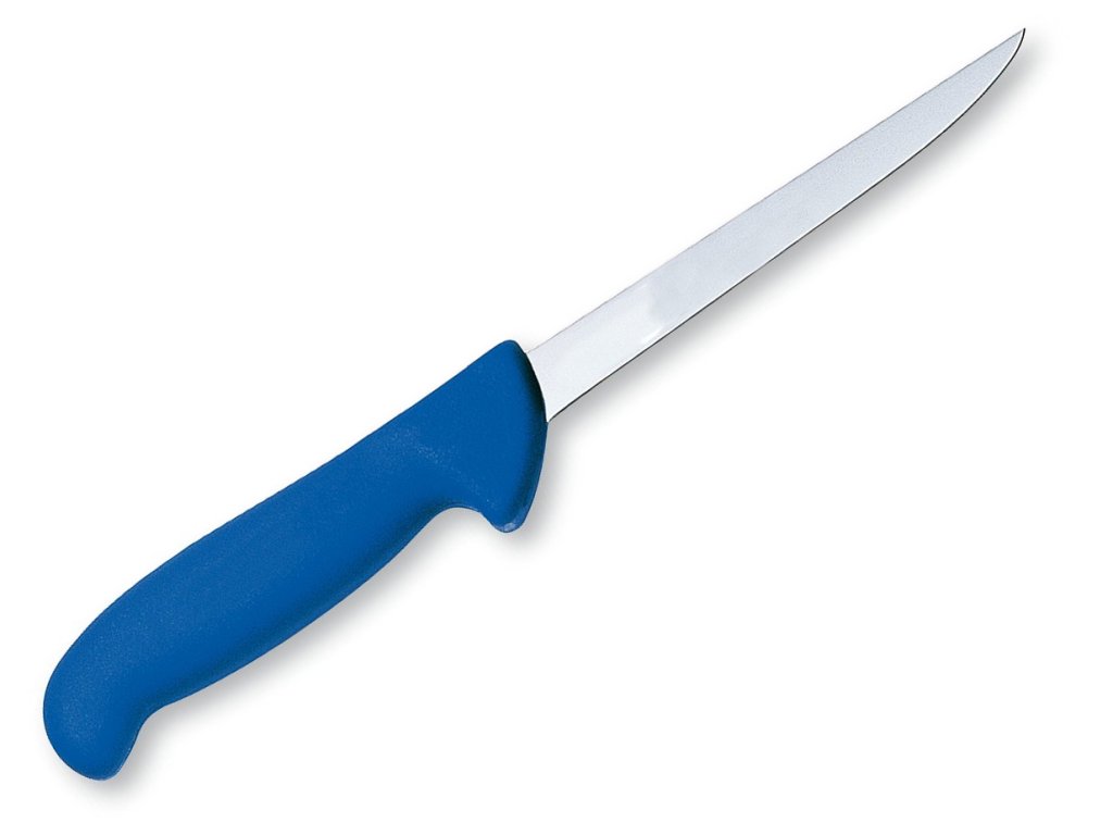 Profesionálny mäsiarsky nôž F. Dick ErgoGrip 8298015 s flexibilnou čepeľou dĺžky 15 cm z nerezovej ocele X55CrMo14 s tvrdosťou 56 HRC slúži na vykosťovanie a spracovanie mäsa. Vyznačuje sa ergonomickou rukoväťou z modrého plastu pre pohodlný a bezpečný úchop aj v mokrom prostredí. Medzi čepeľou a rukoväťou sa nenachádzajú žiadne špáry, v ktorých by sa mohli zachytiť tekutiny. Rukoväť neabsorbuje mastnotu ani nečistoty.