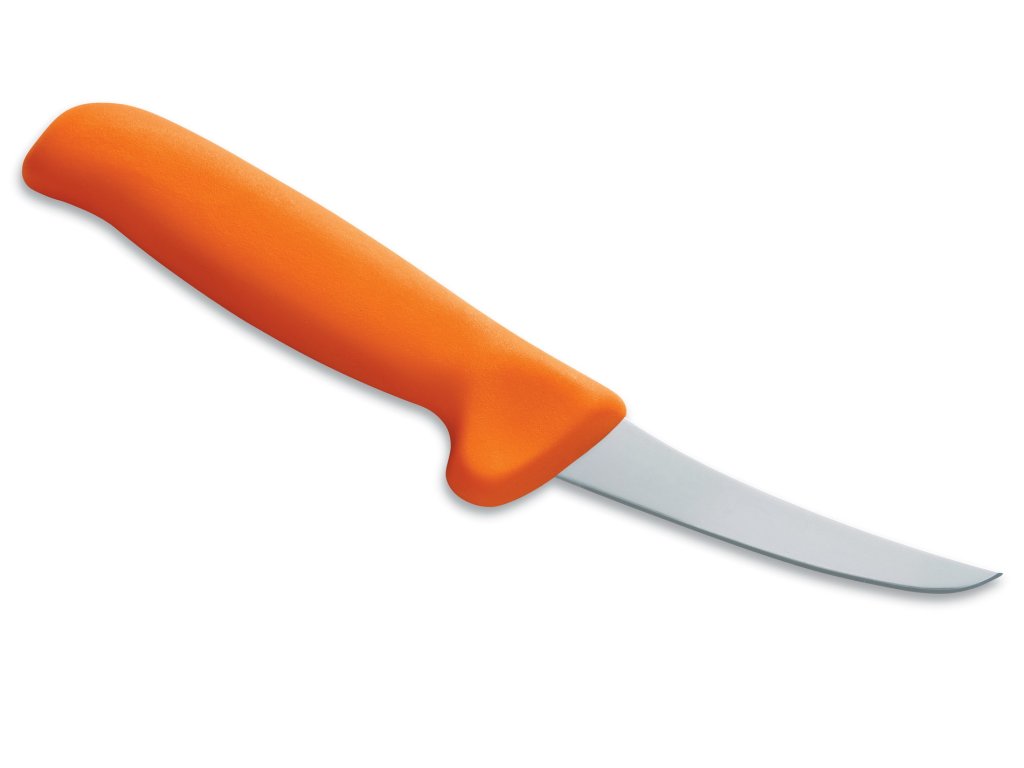 Profesionálny mäsiarsky nôž Dick MasterGrip na vykosťovanie s polo-flexibilnou, zakrivenou čepeľou je stredne veľký nôž s čepeľou o dĺžke 10 cm s využitím na spracovanie mäsa. Čepeľ noža je vyrobená z X55CrMo14 vysoko legovanej, nerezovej nemeckej ocele, ktorá sa vďaka svojim vlastnostiam stala obľúbenou na výrobu kuchynských nožov. Táto oceľ je veľmi húževnatá a dobre odoláva korózii. Ak sa nechcete príliš často trápiť s údržbou nožov, je to pre vás výborná voľba, keďže sa jednoducho brúsi. Plná plastová rukoväť v oranžovej farbe je prispôsobená tvaru a rôznym veľkostiam dlaní tak, aby sa nôž dal používať bezpečne a pohodlne celý pracovný deň. Vďaka kvalitnému plastu nôž nekĺže, čo zaisťuje precíznosť a zároveň vyššiu efektivitu