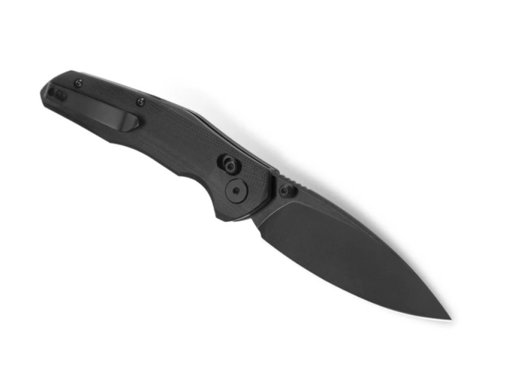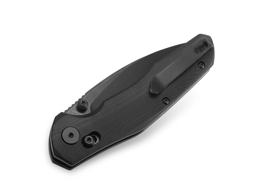 Rukoväť z čiernej G10. Otvára sa pomocou kolíka na palec (thumb stud). Nôž je vybavený poistkou bar lock a čiernym vreckovým klipom na zavesenie s možnosťou hlbokého nosenia (deep carry).