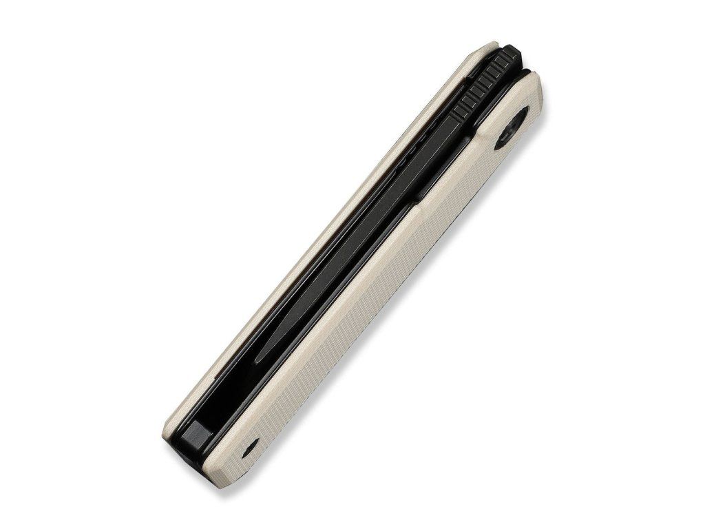 Rukoväť zo slonovinovej (ivory) G10. Otváranie pomocou predného flippera. Uzamknutie noža pomocou poistky liner lock. Čepeľ je uložená na keramických ložiskách.