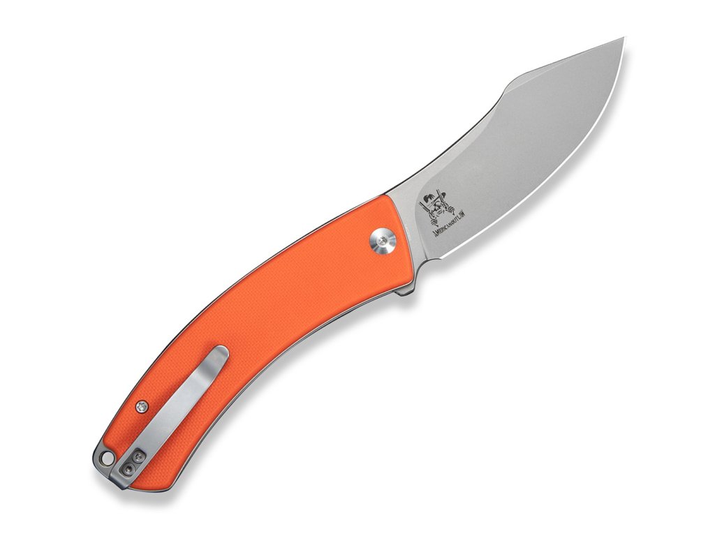 Rukoväť z oranžovej G10 s reverzibilným nerezovým vreckovým klipom. Čepeľ je uložená na keramických ložiskách. Jednoručné otváranie pomocou flippera, poistka button lock.