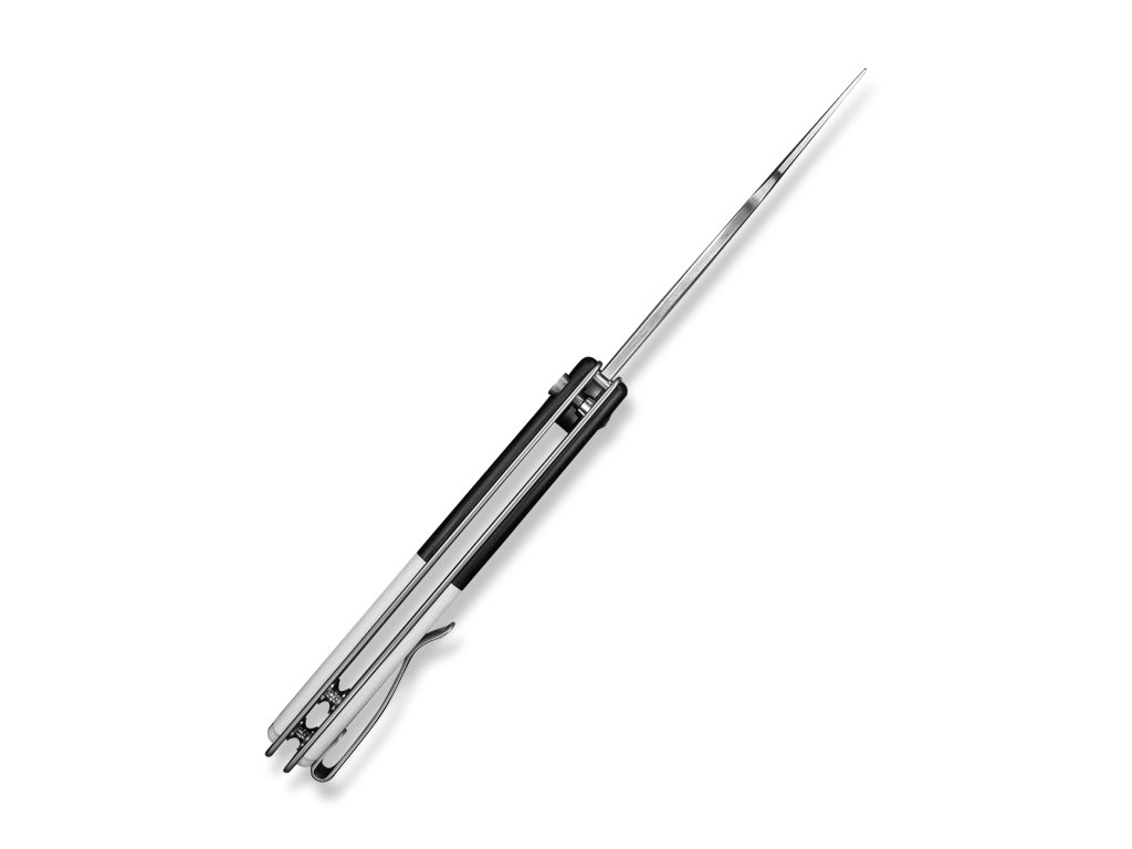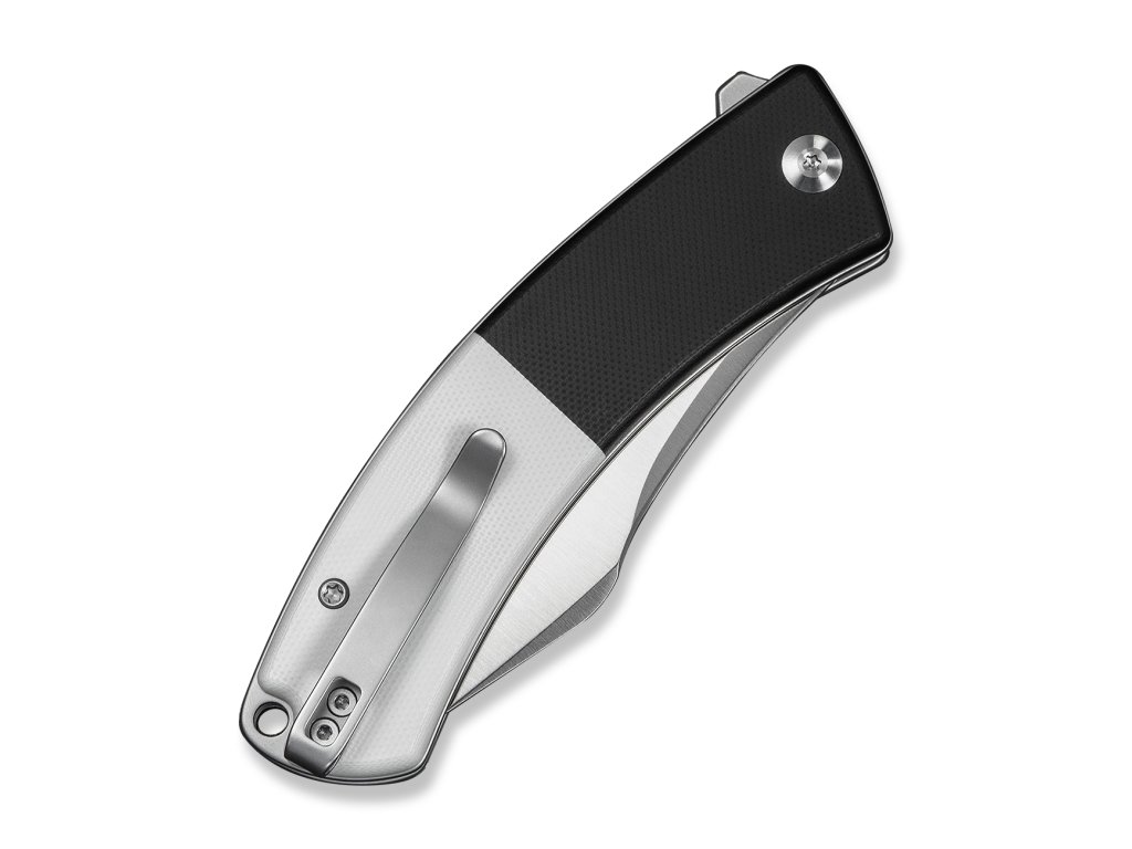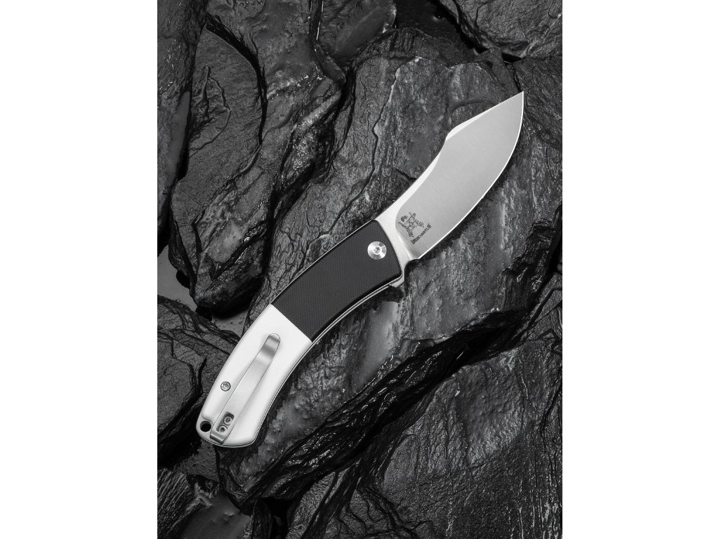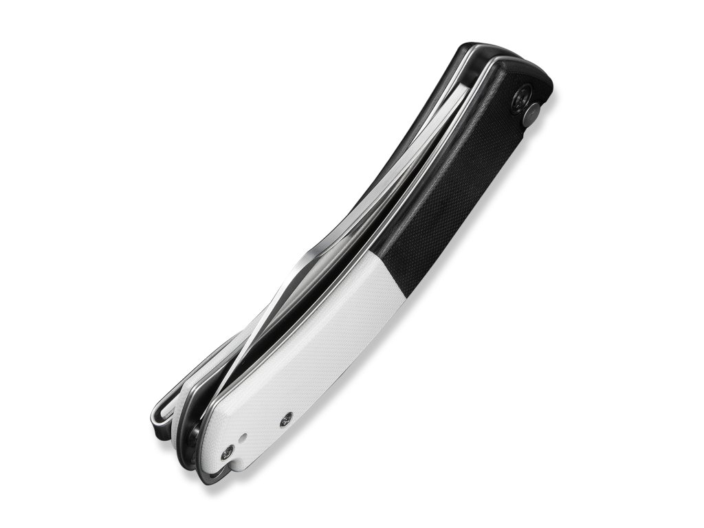 Rukoväť z čiernej a bielej G10 s nerezovým reverzibilným vreckovým klipom. Čepeľ je uložená na keramických ložiskách. Jednoručné otváranie pomocou flippera, poistka button lock.