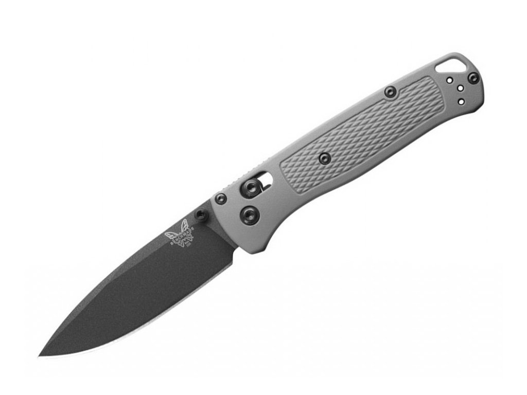 Benchmade Bugout je dlhodobo jeden z najobľúbenejších EDC zatváracích nožov (na každodenné použitie). Vyrobený je z prvotriednych materiálov, je ľahký, štíhly a zároveň ergonomický. Čepeľ dĺžky 8,2 cm je vyrobená z prémiovej nerezovej ocele CPM-S30V (tvrdosť 58-60 HRC), má povrchovú úpravu black cerakote, plochý výbrus a tvar drop point. Rukoväť z plastového materiálu Grivory šedej farby. Nôž disponuje klipom na zavesenie (tip-up), ktorý je reverzibiný na obe strany. Nož je teda vhodný pre pravákov aj ľavákov. Poistka typu Axis Lock, veľký otvor na šnúru - lanyard hole. Jednoručné otváranie pomocou kolíčka na čepeli. Nôž je vyrobený v USA.
