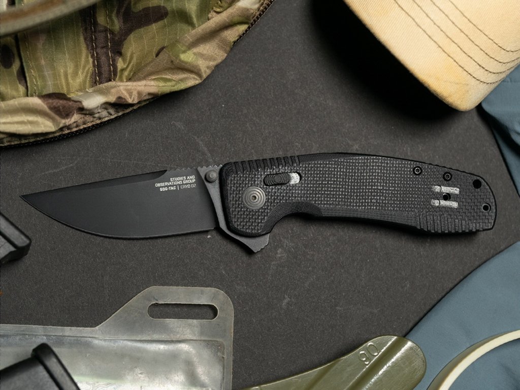 Zatvárací nôž navrhnutý pre záchranné a bezpečnostné zložky, nôž TAC XR má obojručnú poistku SOG XR Lock. Čepeľ z kryogénne upravenej nástrojovej ocele D2 s plochým výbrusom a dĺžkou 8,6 cm a titanium nitride povrchovou úpravou. Črienky rukoväte sú vyrobené z čiernej G10. Obojstranný klip na zavesenie noža z nerezovej ocele. Jednoručné otvorenie pomocou kolíčka na čepeli.